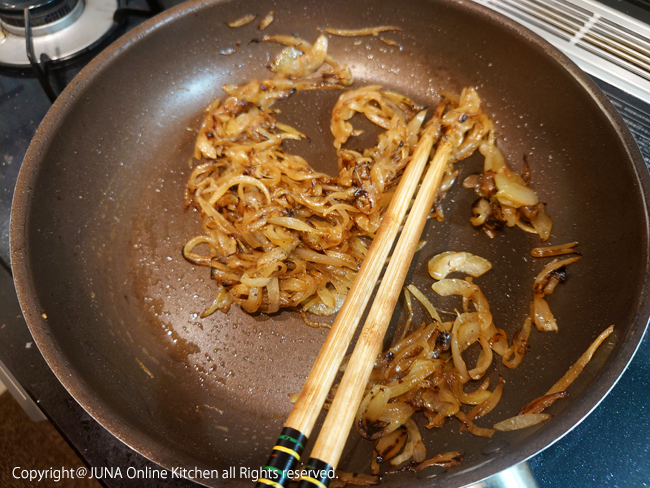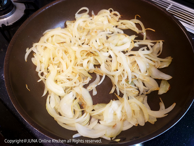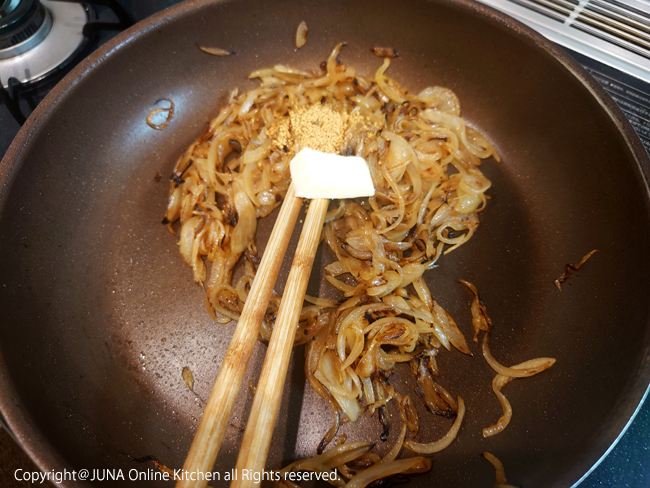 c. タマネギ全体にオイルが回ったら、弱めの中火~中火の火加減で飴色になるまで炒め、コンソメ粉末、バター、おろしにんにく、塩・コショウを加えて調味する(しっかり味を入れます)。