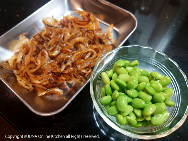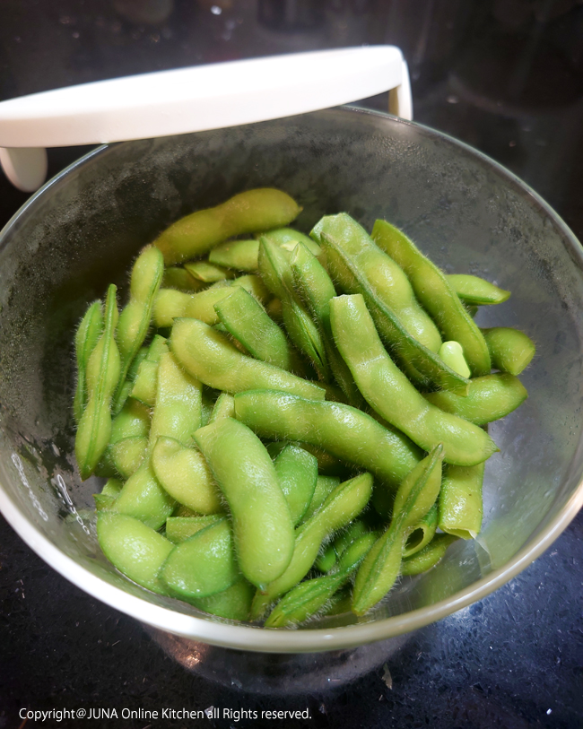枝豆は以下のレシピで作った塩ゆで枝豆を使っています。季節外の場合は冷凍枝豆でも。