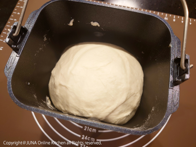 1.ホームベーカリーのパン釜に生地材料を入れ(入れ方はお手持ちのホームベーカリーの方式に準ずる)、一次発酵まですませるコースを選択してスタートする。
