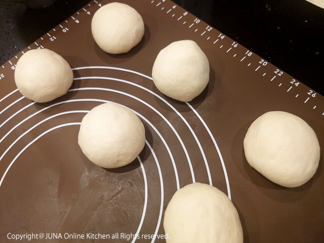 3.発酵が終わったら生地を釜から出して生地総量を計り、6分割して丸める。とじ目を下にして置き、ぬれ布巾+ラップをかぶせて15分休ませる(ベンチタイム)。