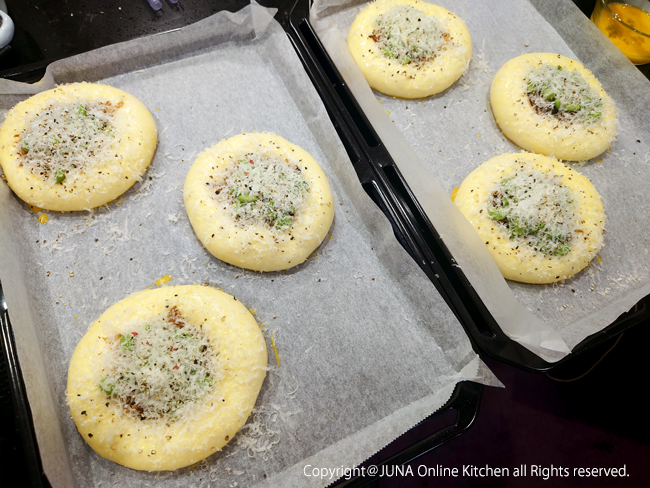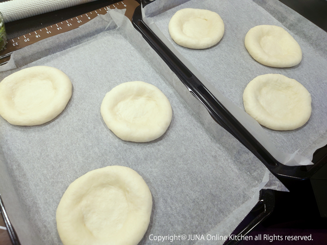 4.3をビザのように縁を厚めにして丸く手で伸ばし、準備の天板に並べる。