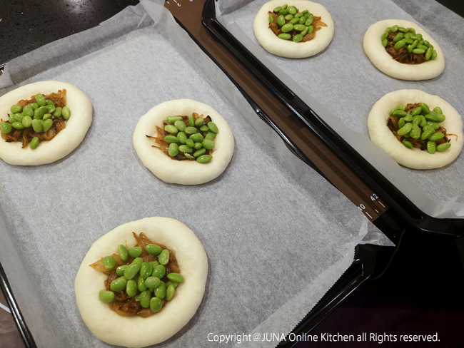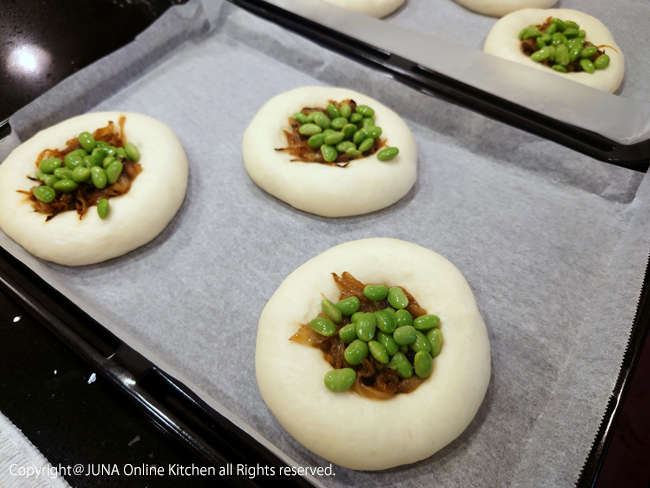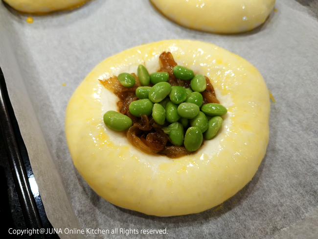 5.4の凹みに2の飴色タマネギをのせ、上に準備の枝豆をのせてフワッとラップを被せ、35℃で35分ほど二次発酵する。一回りボワンと大きくなればOK。