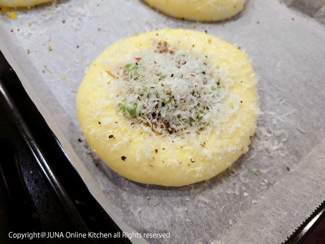 6.パン生地の縁に溶き卵を刷毛で塗り、おろし器でパルミジャーノを削ってたっぷりとかける。さらに粗挽き黒コショウを挽く。