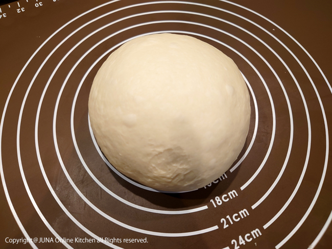 1.ボウルに入っている生地の上面を軽くグーでつぶしてガス抜きをし、作業台にあける(ホームベーカリーの場合は作業台に生地を出してから軽く叩いてガス抜きする)。再び生地を丸め直して下に集まった生地を指でしっかりと閉じ、とじ目を下にして台においたら、パンマット(調理器具参照)+ぬれ布巾+ラップを被せ、15分ほどベンチタイムをとる(生地を休ませる)。