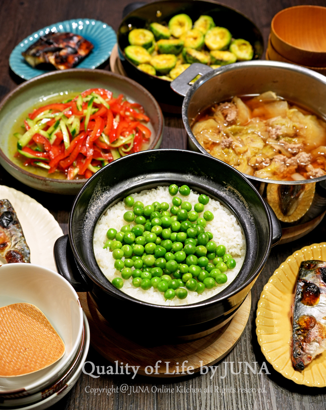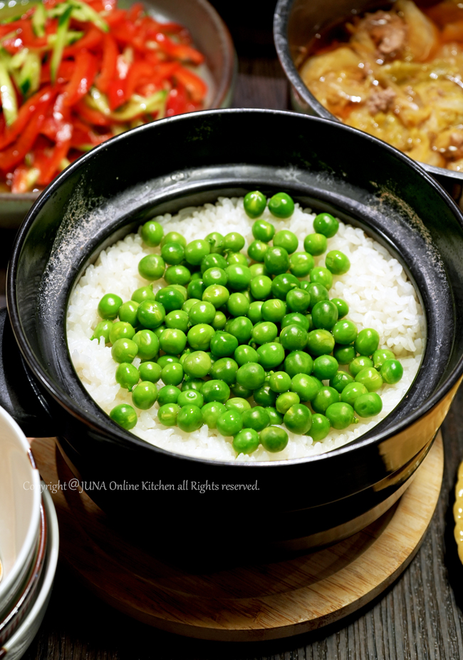 ※グリンピースの量は厳密にこのぐらいでなければいけないという決まりはありません。その時手に入る量で、豆の密度を上げたければ米を少なめに、米感アップしたければ米の量を多めにといった感じでOKです。