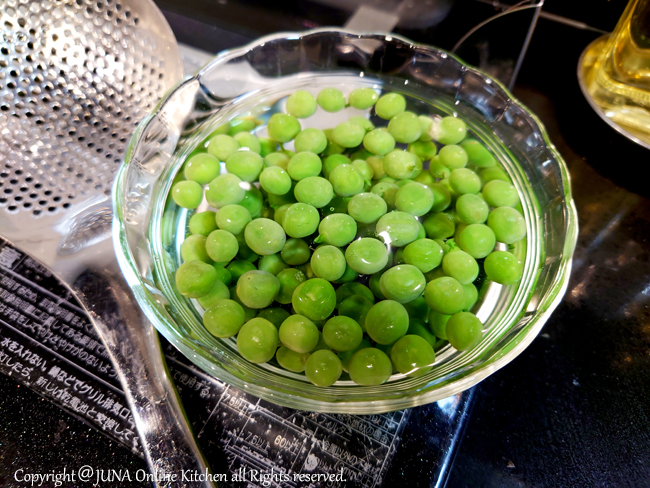 3.グリンピースを冷水にとってしばらくおく。温度が下がったら水からあげておく。