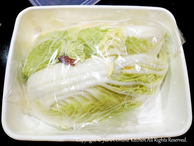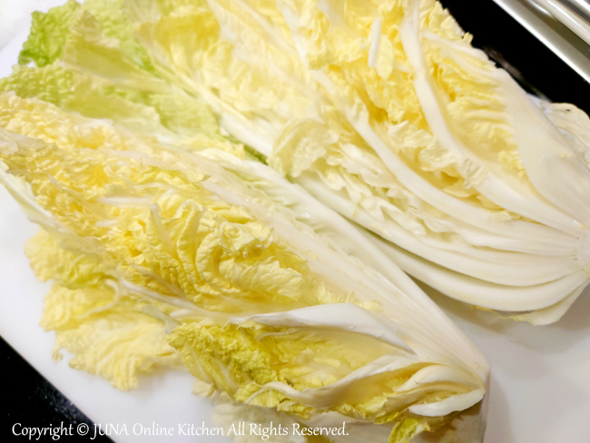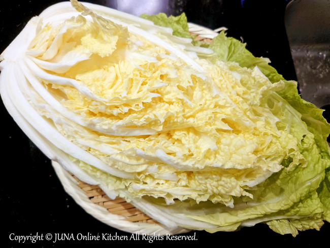 1.白菜は芯を付けたまま(汚れている部分は包丁でカット)しっかりと洗い、布巾などに包んで水気をある程度吸ったあと、ざるにおいて風通しのいい涼しい場所に丸1日ほどおく。