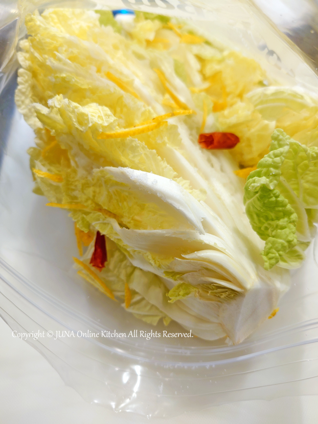 2.完全に水気がきれた白菜をさらに半分に切り、大きな袋に塩、唐辛子(半分に折って種はのぞく)、柚子の皮とともに入れる。