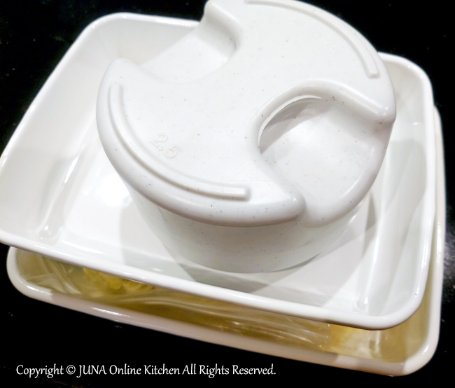 漬物石は2.5キロのものを使っています。漬物用の重石がなければ、飲料が入ったペットボトル、砂糖の1キロ袋や塩の1キロ袋などを駆使してのせるといいです。