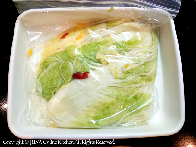 袋だけで冷蔵庫に入れて重石をのせると液漏れするため、必ずバットに入れてから重石を乗せるようにします。