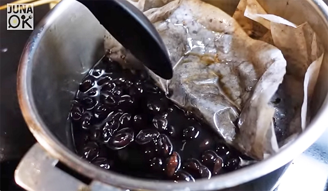 最初から砂糖を入れたものに一晩黒豆を浸す方法で作っていますが、