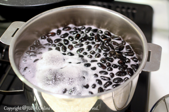 粒が小さめの黒豆の場合は、長時間煮ると煮崩れる場合があるので、気をつけます。