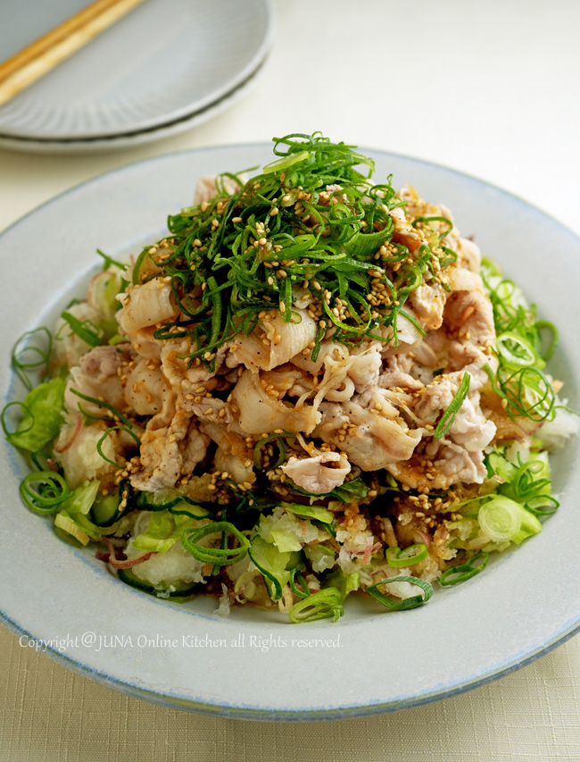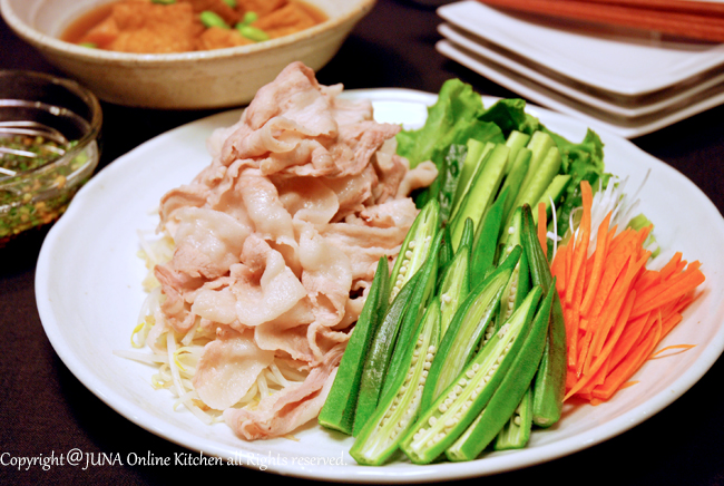 豚バラの薄切り肉使用。さっとゆでたもやしの上に乗せています。添えている野菜は、サニーレタス、白ネギ、にんじん、きゅうり、オクラ。豚肉に好みで野菜を巻き、レシピと同様のタレをかけて食べます。野菜と一緒だとバラ肉でもさっぱり食べられます。