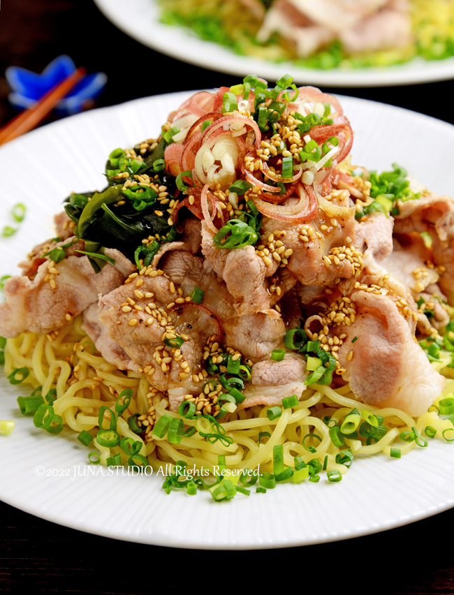 豚しゃぶの下に新タマネギのスライスをたっぷり敷き、上には刻みねぎをたっぷりと。ごま油とぽん酢をかけてあります。食べる時好き好きに辛味(ラー油やコショウなど)をかけていただきます。