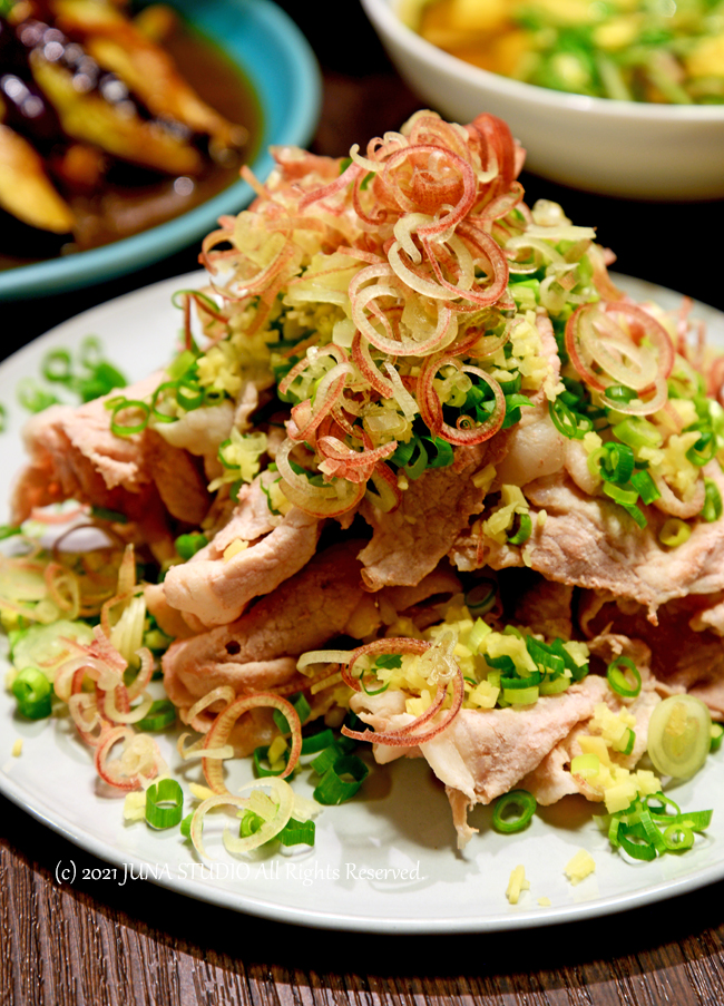 ゆでた豚しゃぶの上に、みょうが(小口切りにして氷水にさらしたもの)、しょうが(みじん切り)、刻みねぎをのせています。ぽん酢やしょうゆ、ごまダレをかけていただきます。