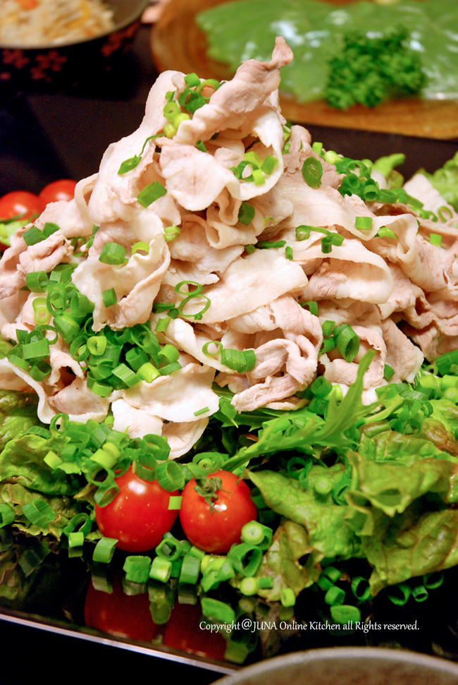 たっぷりのサニーレタスと水菜を敷き、豚しゃぶの上にはねぎをパラパラ。彩りにはプチトマトを。各自好きな量を皿に取り分け、タレをかけてサラダのような感覚で食べます。