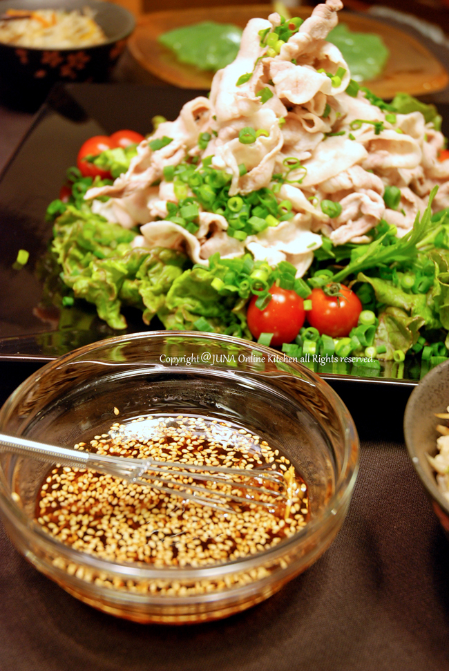 2.付け合わせを盛った皿に豚しゃぶをのせ、タレを添える。卓上で各自好みに皿に取り、タレをかけて食べる。