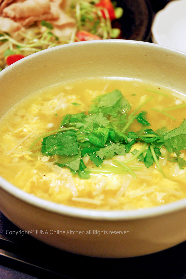 3.2にえのき(1/2束ほど)を2cm幅ほどに切って加え、再び沸騰したら溶き卵2個分を回し入れ、卵が好みの固さになるまで煮る。仕上げにコショウを加える。