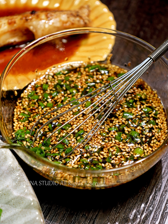 1.タレ材料の細ねぎ、しょうがはみじん切りにし、他の材料とともに容器に入れて混ぜ合せる。