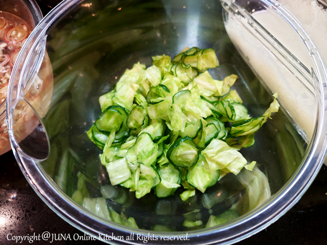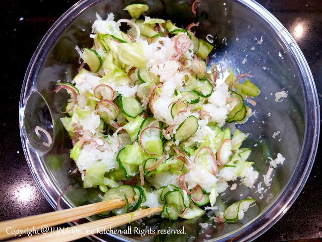 3.ボウルに1の大根おろし(出た汁気は入れない)、水気をギュッとしぼったキャベツときゅうり、ざるにあげて水気をキッチンペーパーでおさえたみょうがを加えてよく和える。冷蔵庫でしばらく冷やす。