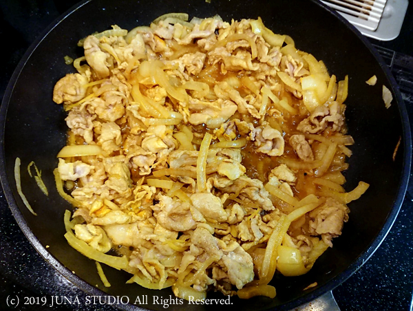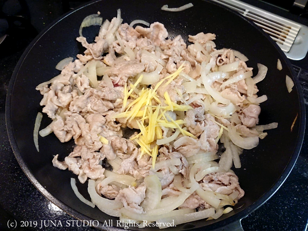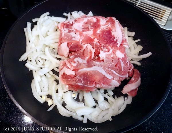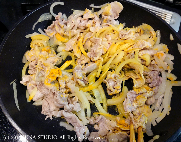 タマネギは繊維を断って切ることで豚肉とよく絡み合います。ごはんなどにのっけても!