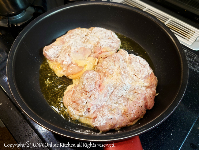4.フライパンにオリーブオイルをひいて弱めの中火でよく温め、3の余分な粉を落として皮目から焼く。