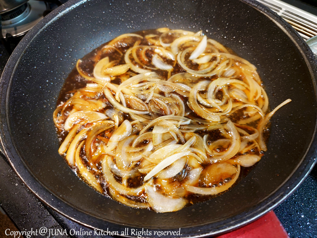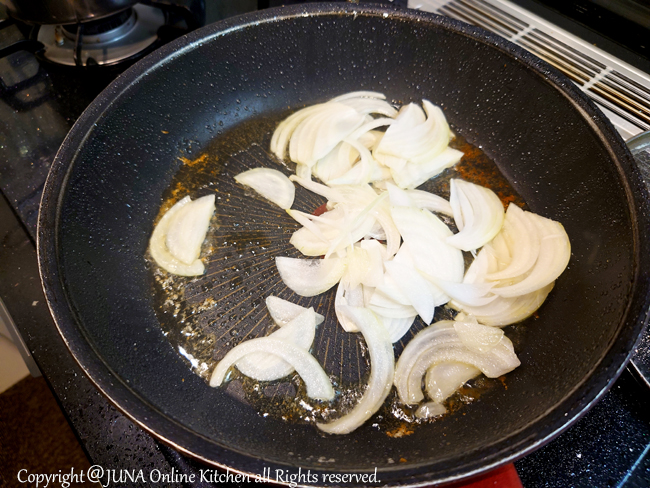 1.鶏肉を焼いたフライパン(オイルはそのまま使います)を中火にかけ、タマネギを炒める。