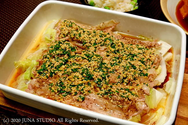 大きめのホーローバットに白菜と豚肉をのせて直火で蒸し、そのまま食卓へ!
