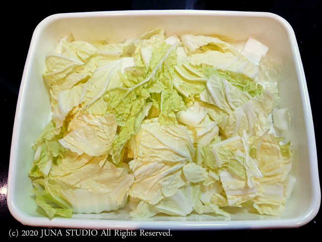 1.白菜は水洗いしたあと水気をきり、ざく切りにしてホーローバットに広げる。日本酒を全体にふりかける。