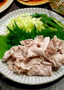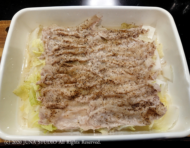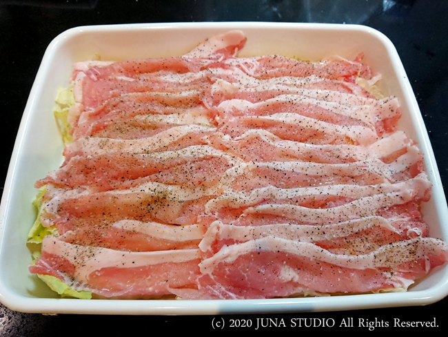 2. 1の上に豚肉を広げて並べ、塩・コショウをする。