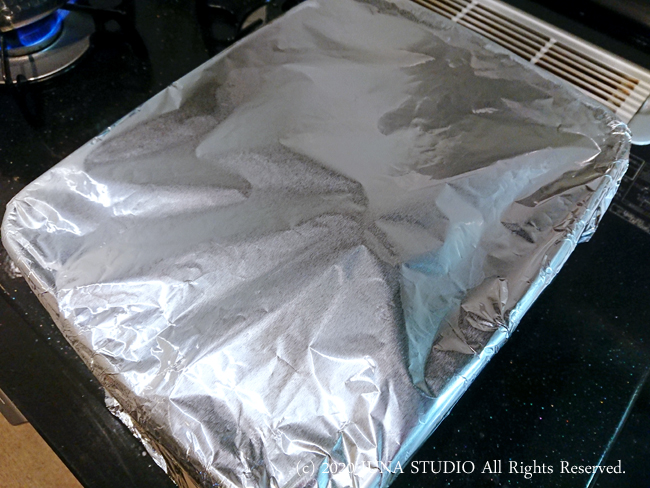 3. 2の上面をアルミ箔で全て覆い、コンロにそのままおいて、弱火と中火の間くらいの火にかけ、15~17分蒸し焼きにする。