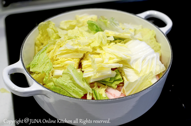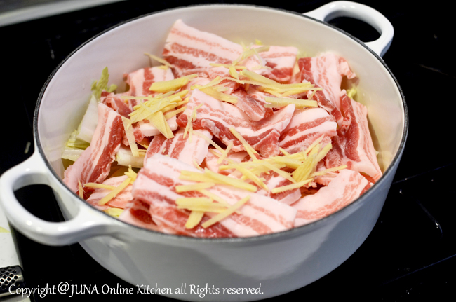 2. 鍋に白菜の半量を入れてその上に豚肉、しょうがをのせ、さらに残りの白菜をのせる。