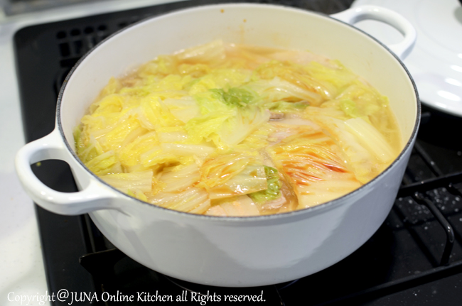 鍋にだしを入れた時に水分量が少なく感じますが、加熱すると白菜から水分が出るのでご安心ください。
