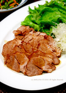 写真では焼き肉用の厚めの豚ばら肉を使って食べ応えのあるものにしていますが、