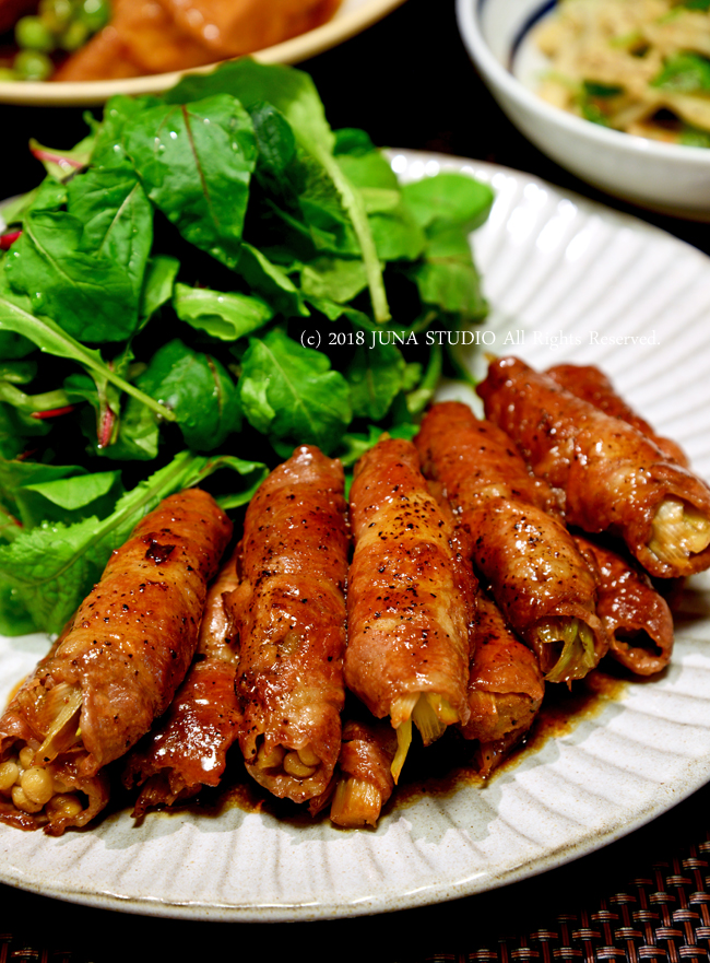 【豚ロース肉】:インゲンは切らず、3本(または4本)をセットにして豚ロース肉を斜めにずらすようにしながら、インゲンの上から下までクルクル巻く→5本作る。