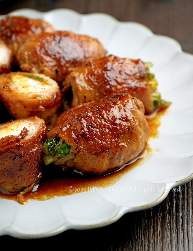 かぶを葉とともに豚肉で巻き、さっぱりぽん酢仕立てのソースでいただきます。