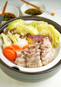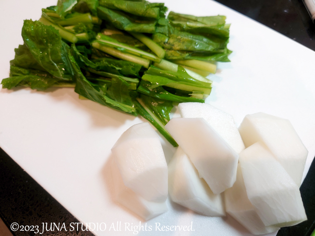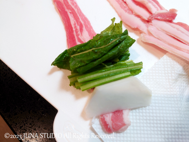 1.かぶは皮をむき、8つのくし形切りにする。かぶの葉は4cm幅ほどに切り8等分する。豚肉は12枚のうち4枚を半分の長さに切る。