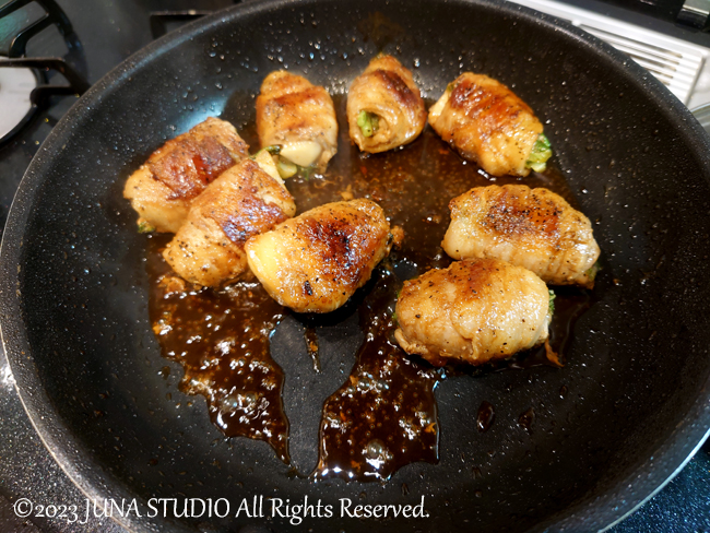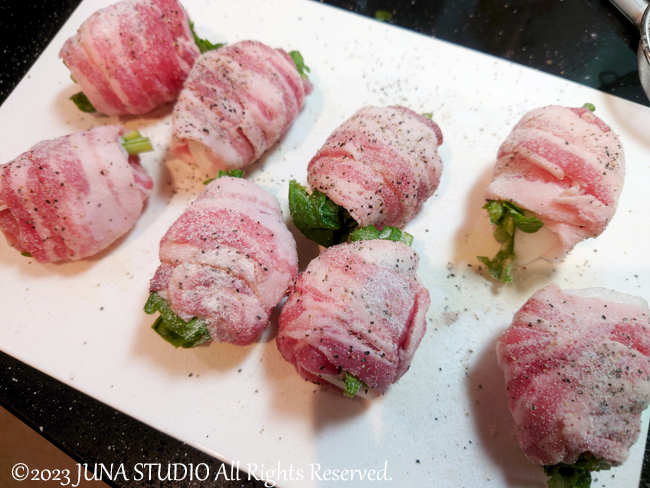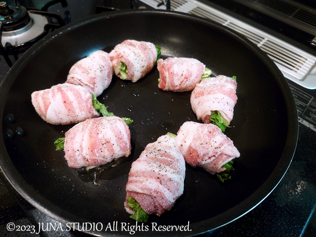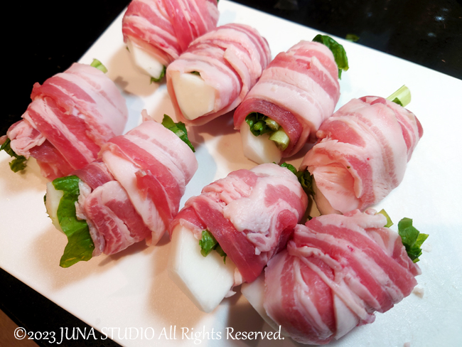 豚肉は肉巻き1個につき、1.5枚を使用するとかぶをしっかりと包み込めます。両端の外側は見えてもかまわないので、幅全体を覆うように巻いていきましょう。