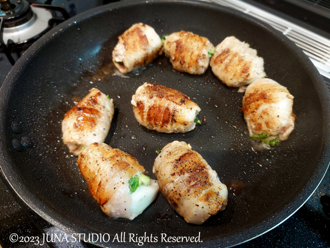 4.フライパンに薄く油(分量外:適量)をひいて中火にかけ、3の巻き終わりを下にして焼く。焼き色が付いたら他の面もまんべんなく焼き色がつくように焼く。