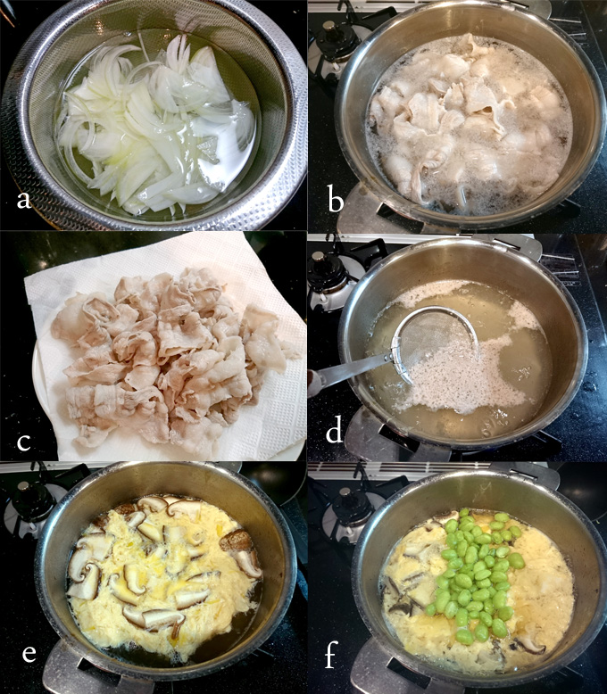 2. 豚肉をゆでたゆで汁をいったん沸かしてアクをすべてすくい取ったら、中火にして1のしいたけ、しょうがを加え、塩、しょうゆで好みの塩加減に調味する。