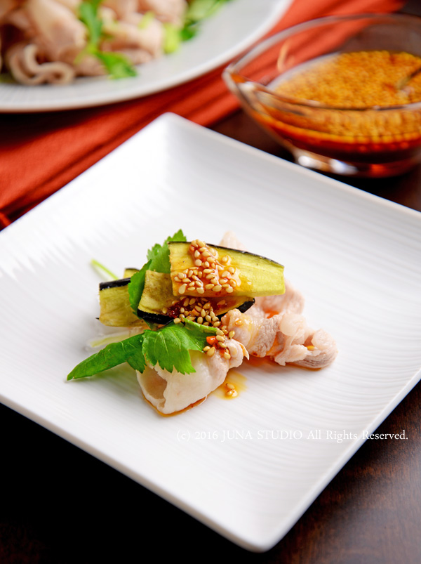 4. 皿の中央に1のタマネギを盛り、まわりに3の豚肉をおく。タマネギの上にフリーズドライのなす(もどす必要はなし)をこんもりとのせ、周りに三つ葉を散らす。ソースを添えれば完成。