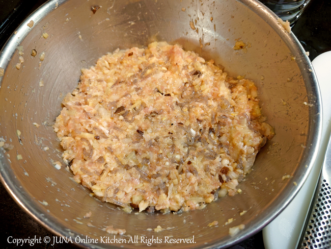 5.ボウルにひき肉、2の芯の部分、3(残した糸こんにゃく以外)、4、卵、【A】を入れ、手で粘りが出るまで混ぜ合わせて6等分する。