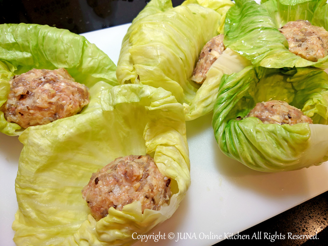 6.キャベツの芯側を手前におき、タネをのせて包む。残した糸こんにゃくで縛って固定する。