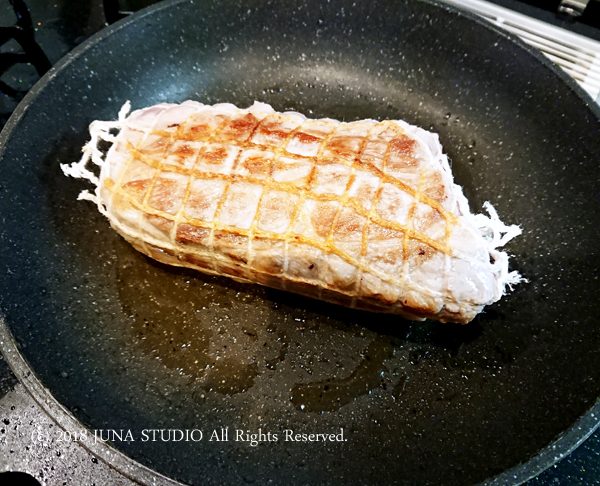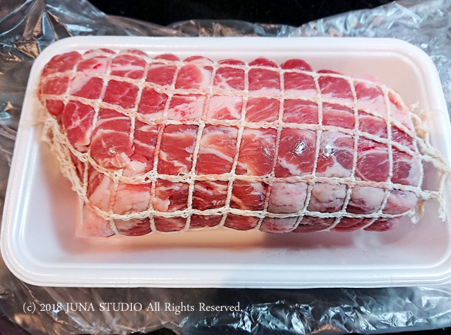 豚肉は、写真のようにネットに入れてあるものを買うと便利です。ない場合は、全体を食品用たこ糸で固定します。スーパーによってはかたまり肉を包む用のネットがおいてあることもあるので、聞いてみるといいです。