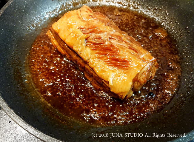 6. (このまま全部の水分を飛ばし切るのは大変なので)フライパンに煮汁お玉に3~4杯+肉を移し、時々肉を転がしながら火を入れる。煮汁がトロっとしてきたら縛っていたひもをはずし、全体に照りが出るようにタレを絡める。