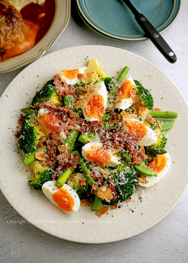 ② グリーン野菜と卵のカリカリパルミジャーノがけ