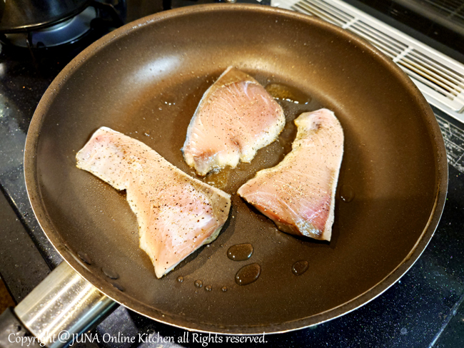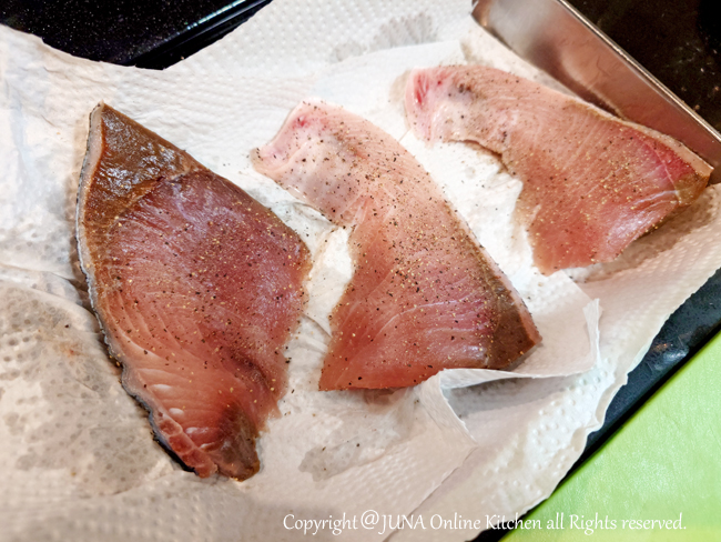 4.ぶりの表面に出た水分をキッチンペーパーで押さえ、両面にコショウをする。