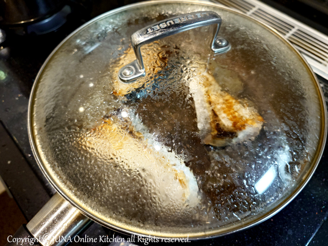 6.軽く焼き色が付いたら日本酒を加えてふたをし、日本酒がほぼなくなるまで数分(2~3分目安)蒸し焼きにする。
