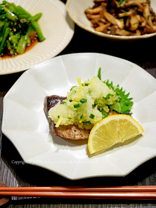 フライパンで焼いたぶりに、たっぷりのおろしをのせた1品。