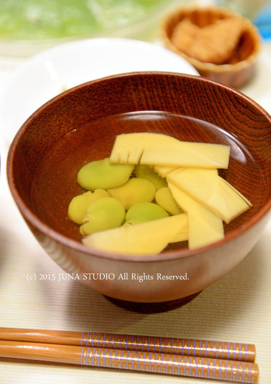 たけのこのやわらかい穂先だけを使ったすまし汁です。ぬか等でしっかりと下ゆでした、新鮮なたけのこの先端を使用します。